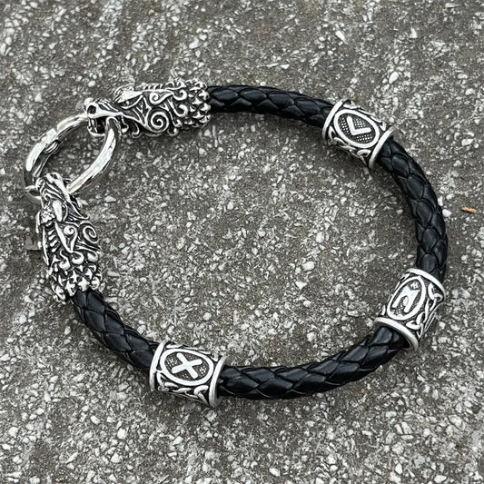 Viking Dragon Heads Nordic Runes Beads Leather Bracelet