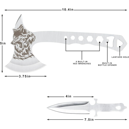 3-Piece Throwing Axe & Tomahawk Set with Built-in Corkscrew & Protective Sheath, Full Tang Stainless Steel 10.4'', Silver