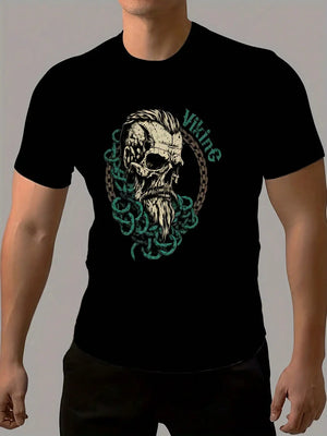 1pc Viking Skull Print T-Shirt for Men, Casual Crew Neck, 100% Polyester Knit Fabric, Reguler Print Design, S