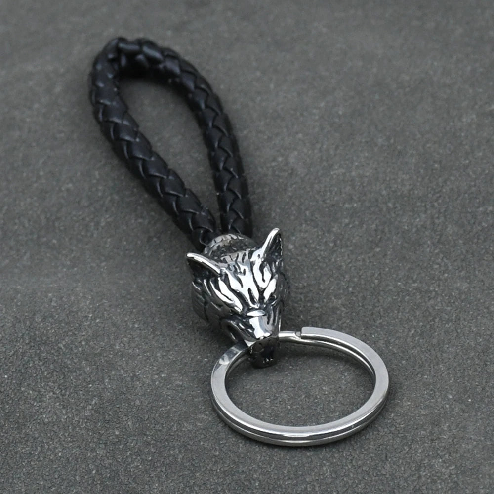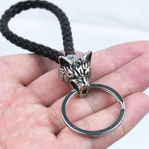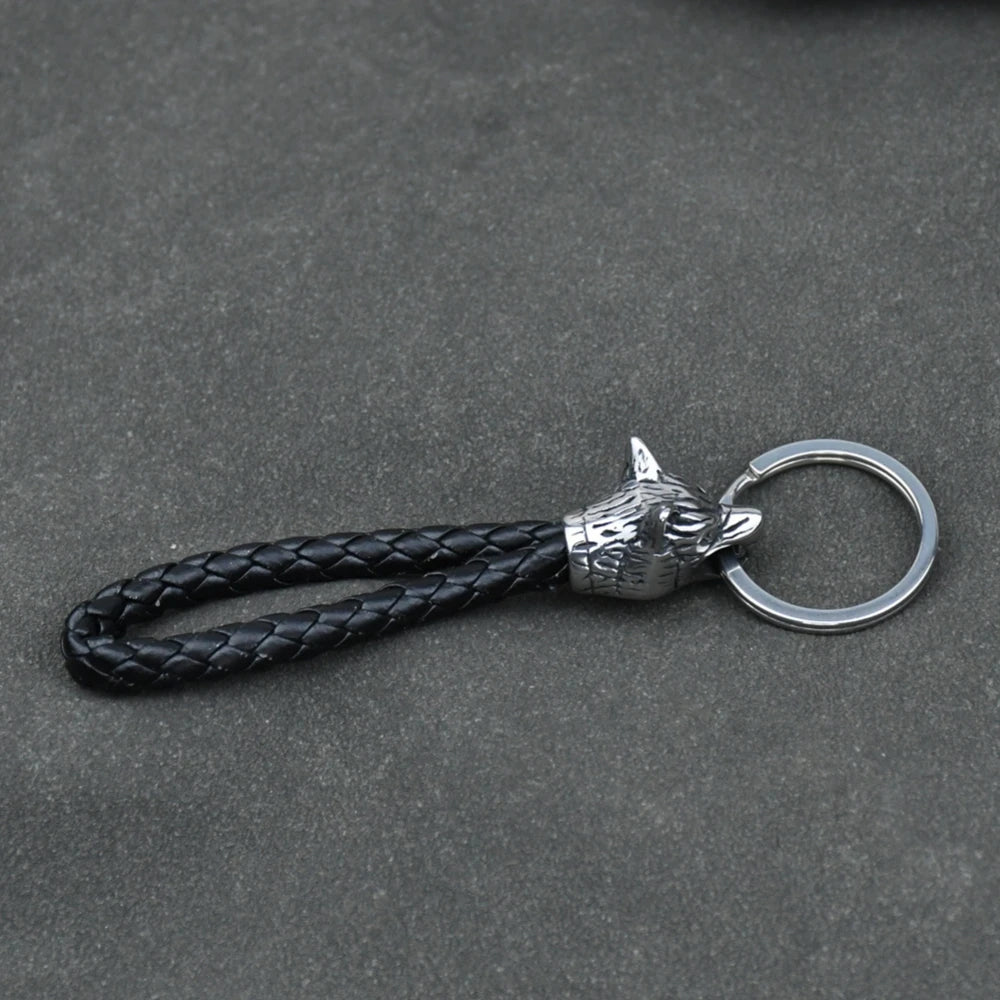 Stainless Steel Wolf Amulet Braided Leather Keychain Viking