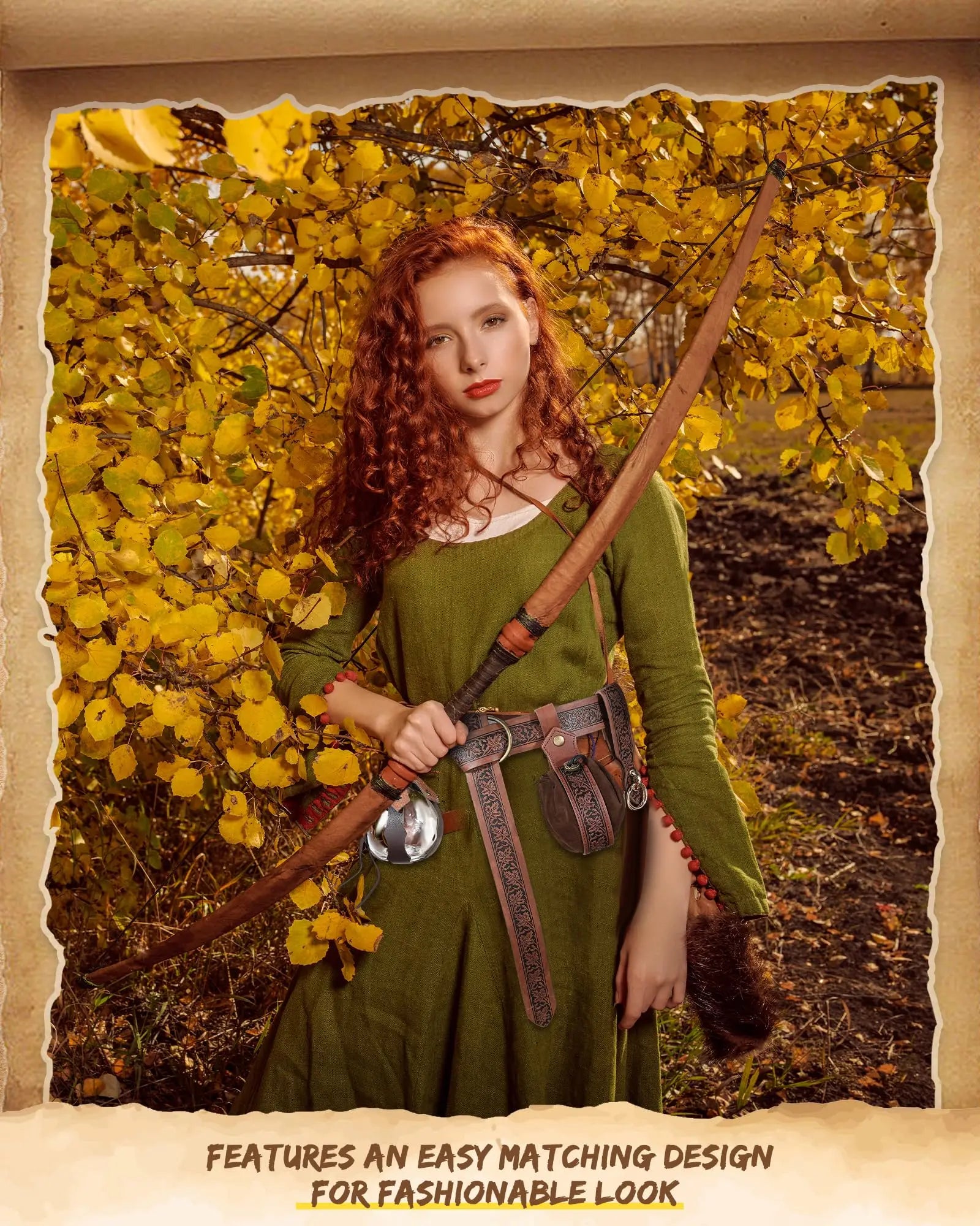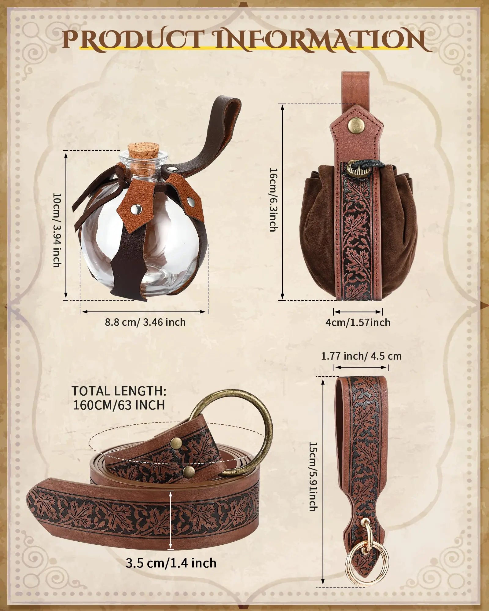 5-Piece Set of Unisex Renaissance Viking Steampunk, Medieval, Renaissance, Artificial Leather Belt, Hiking, Bottle, Wallet