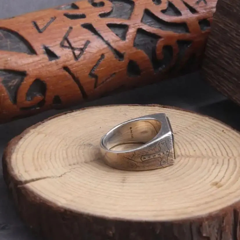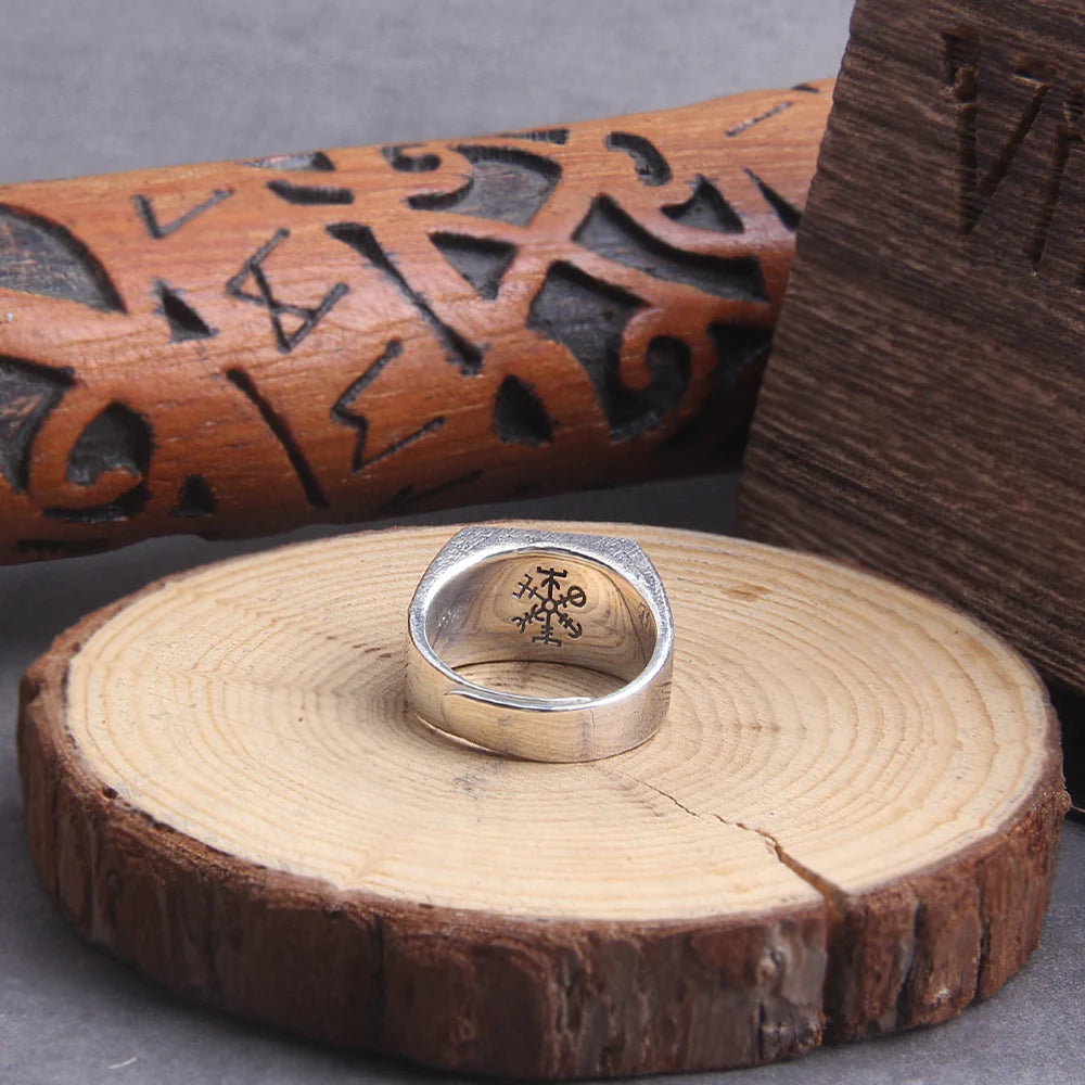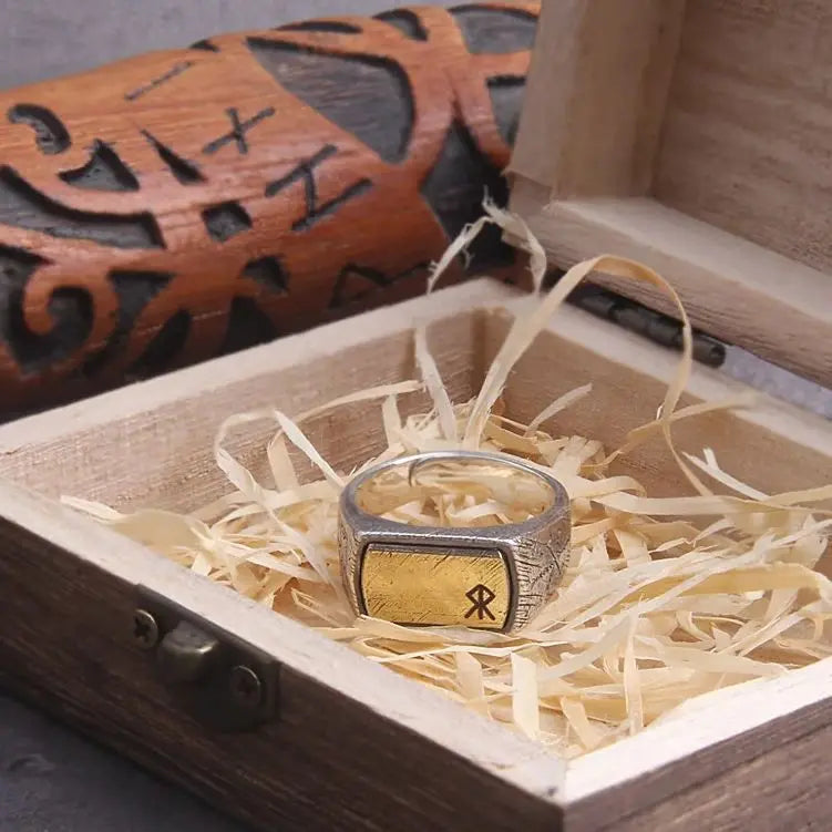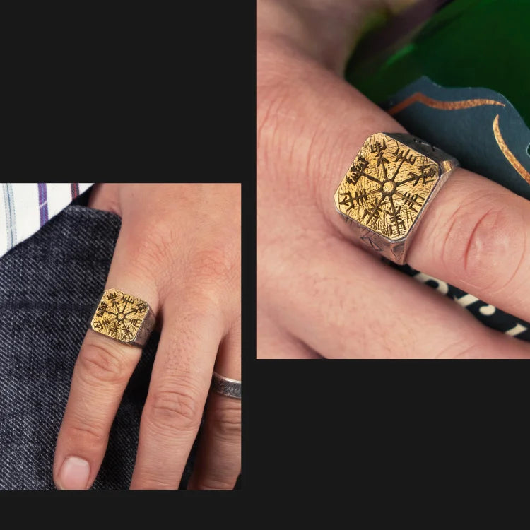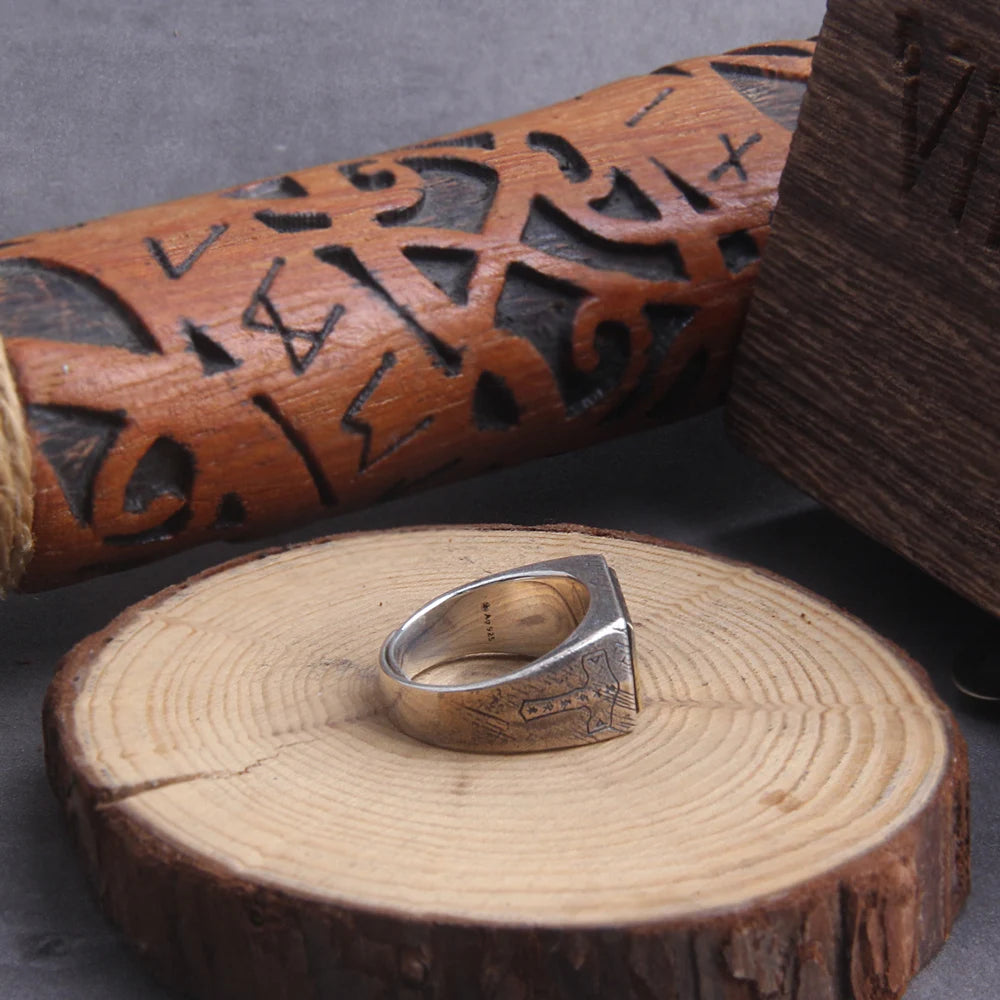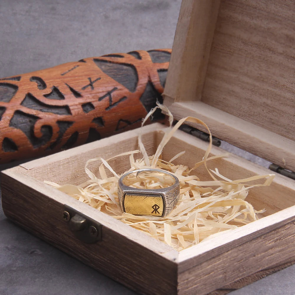 925 sterling silver Thor’s Hammer Mjölnir and vegvisir ring as gift with vintage wood viking box
