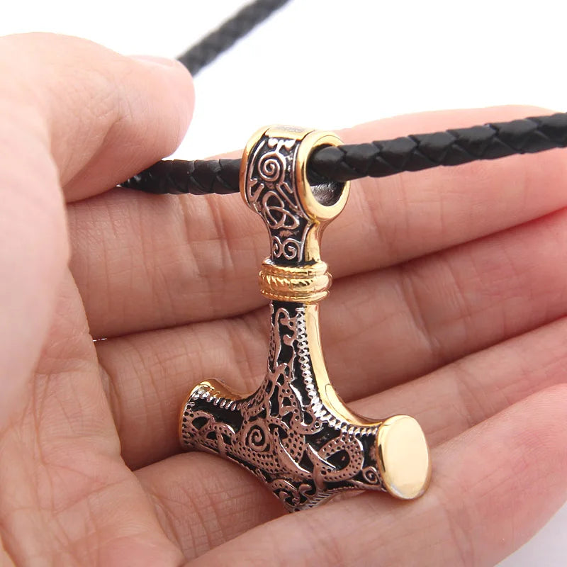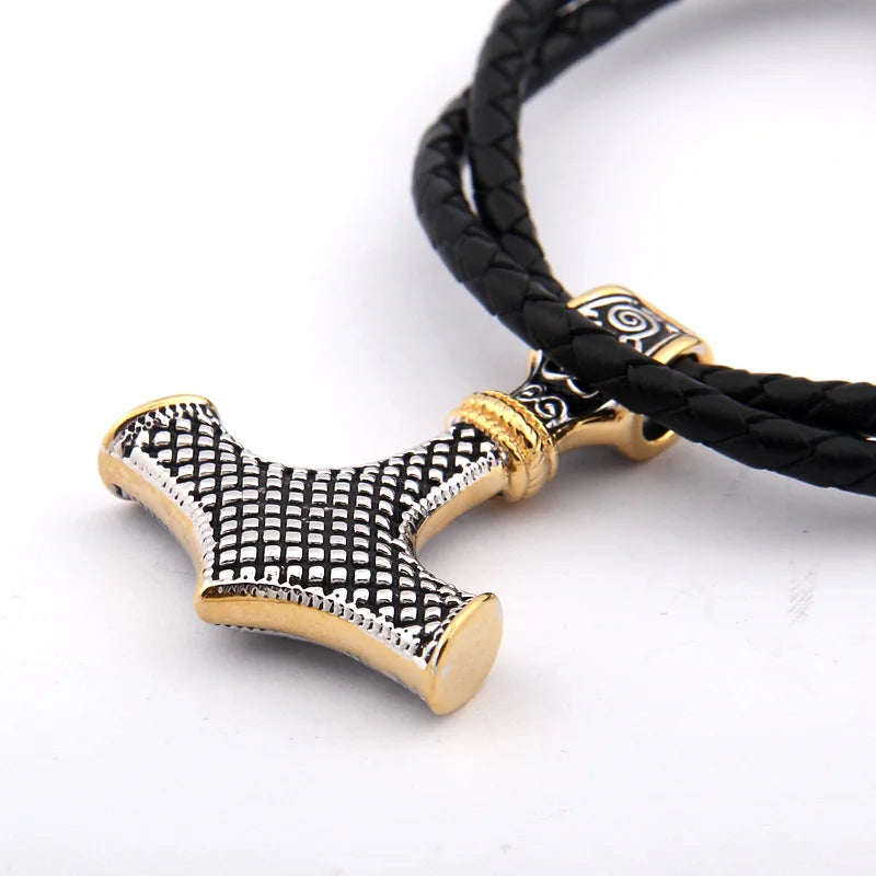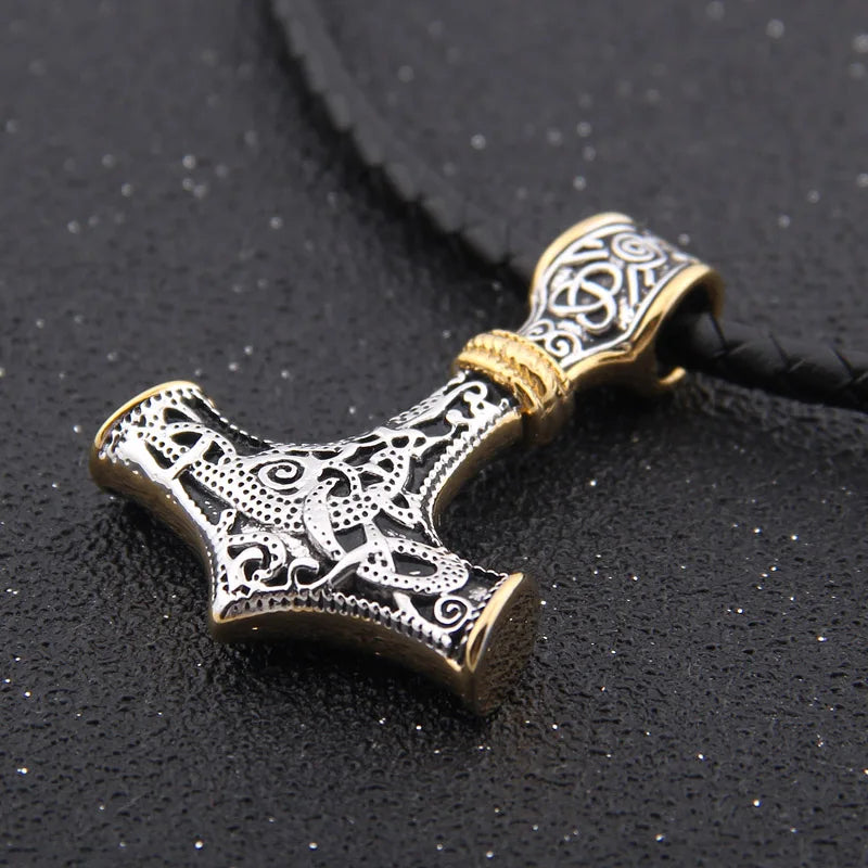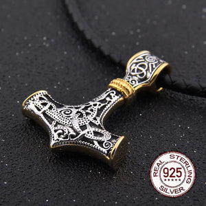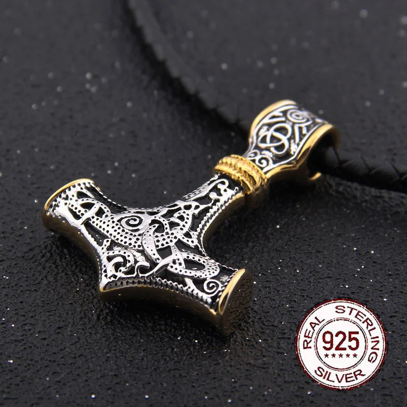Name:925 Sterling Silver Viking thor's hammer pendant necklace with real leather and stainless steel keel chain as gift