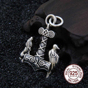 Sterling Silver Viking wolf and raven thor's hammer necklace with real leather and keel chain