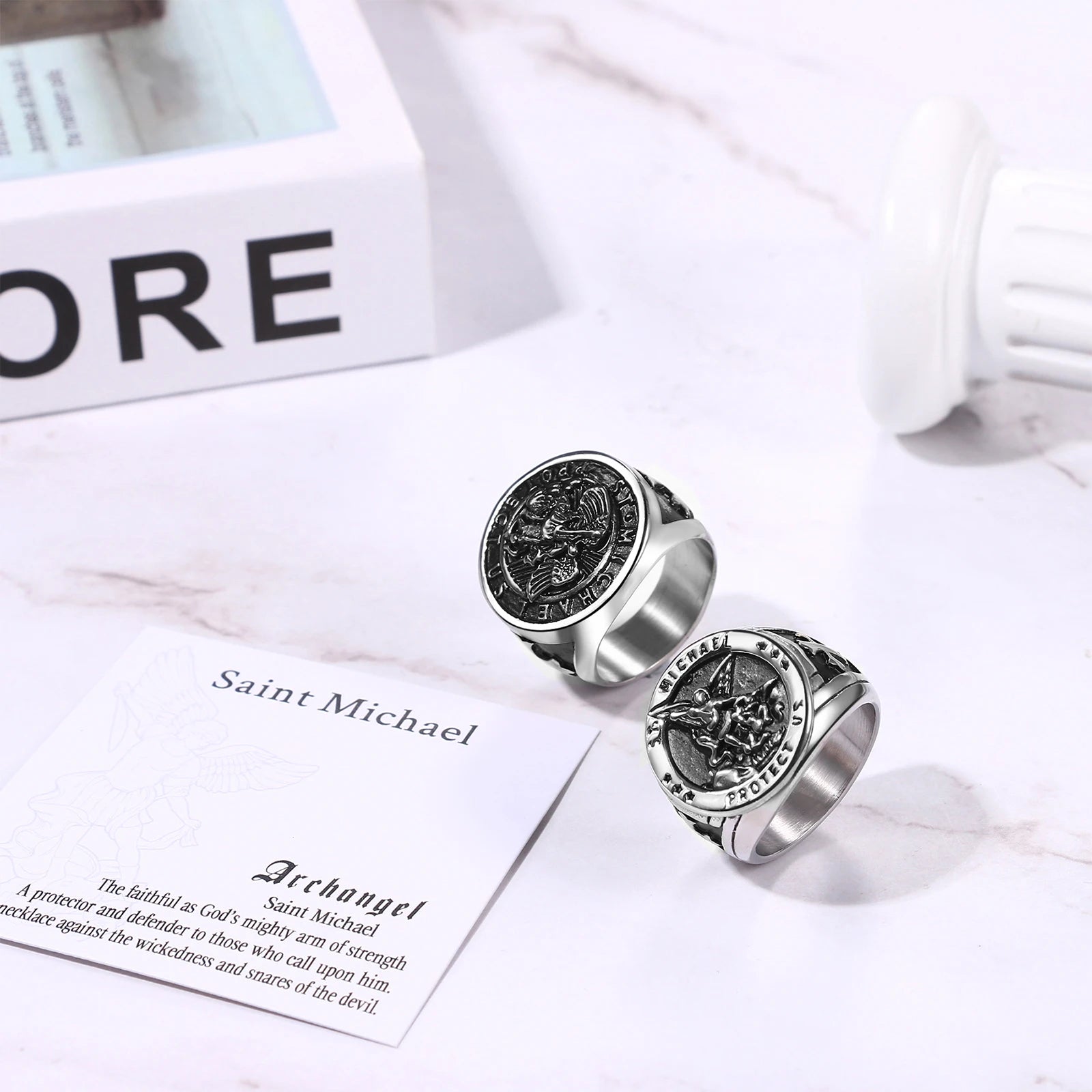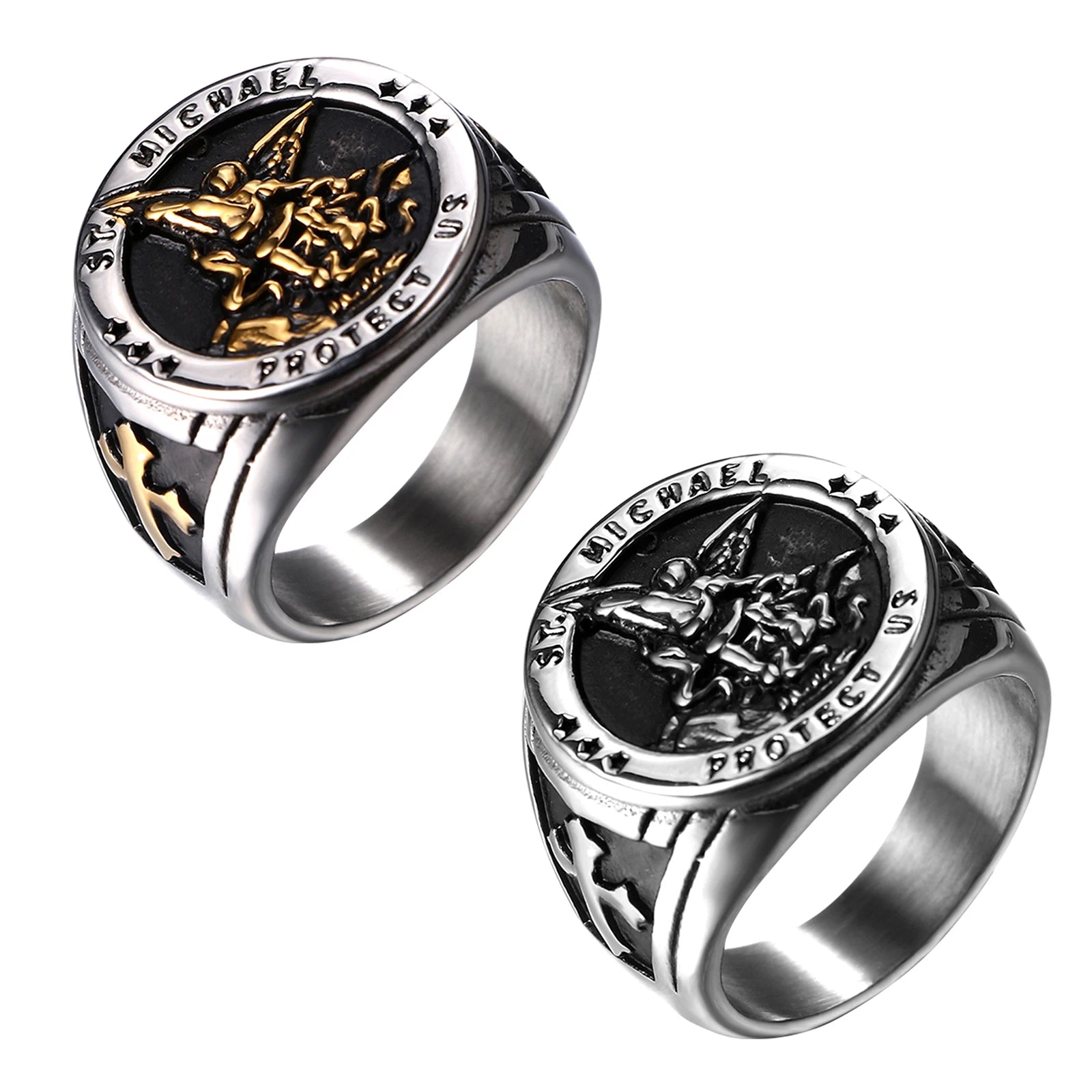 BONISKISS Men's St. Michael Ring Religious Seal Stainless Steel Ring Amulet Jewelry Gift Vintage Golden Sliver Male Fashionable