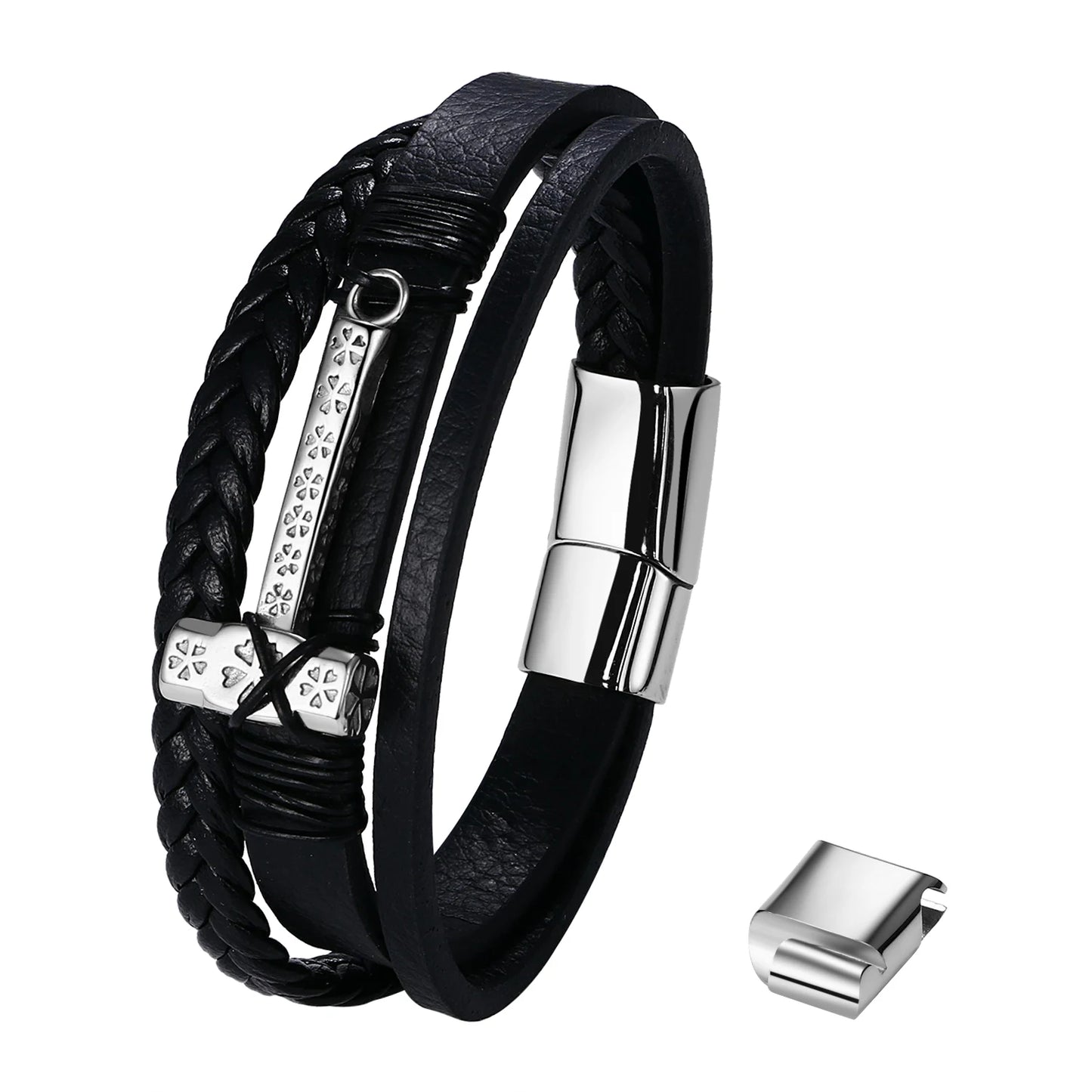This stunning men's black leather stainless steel bangle bracelet will definitely add an impressive trendy touch to your look. It is the perfect gift for any occasion - Christmas, Birthday, Father's Day, Valentine's Day, Graduation.