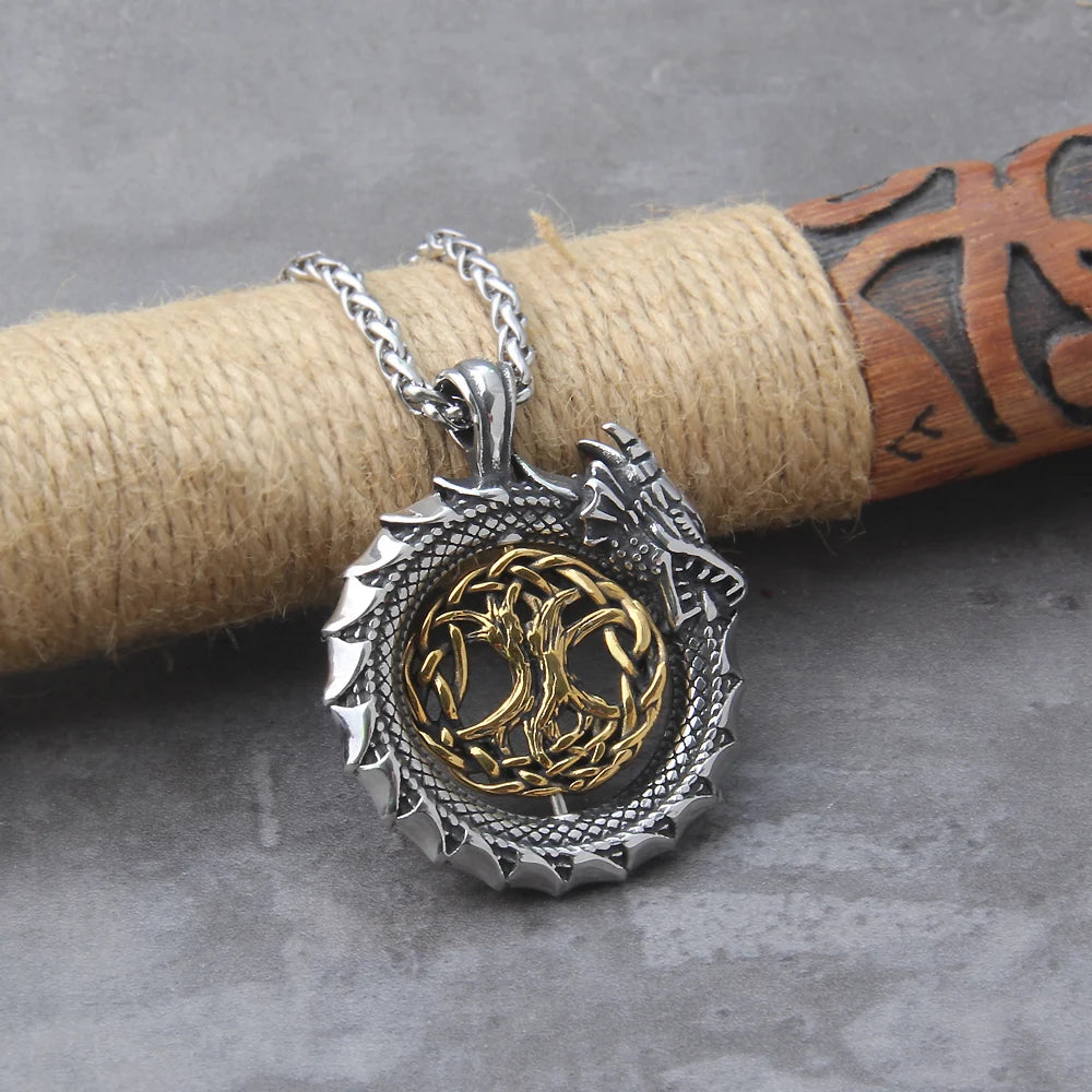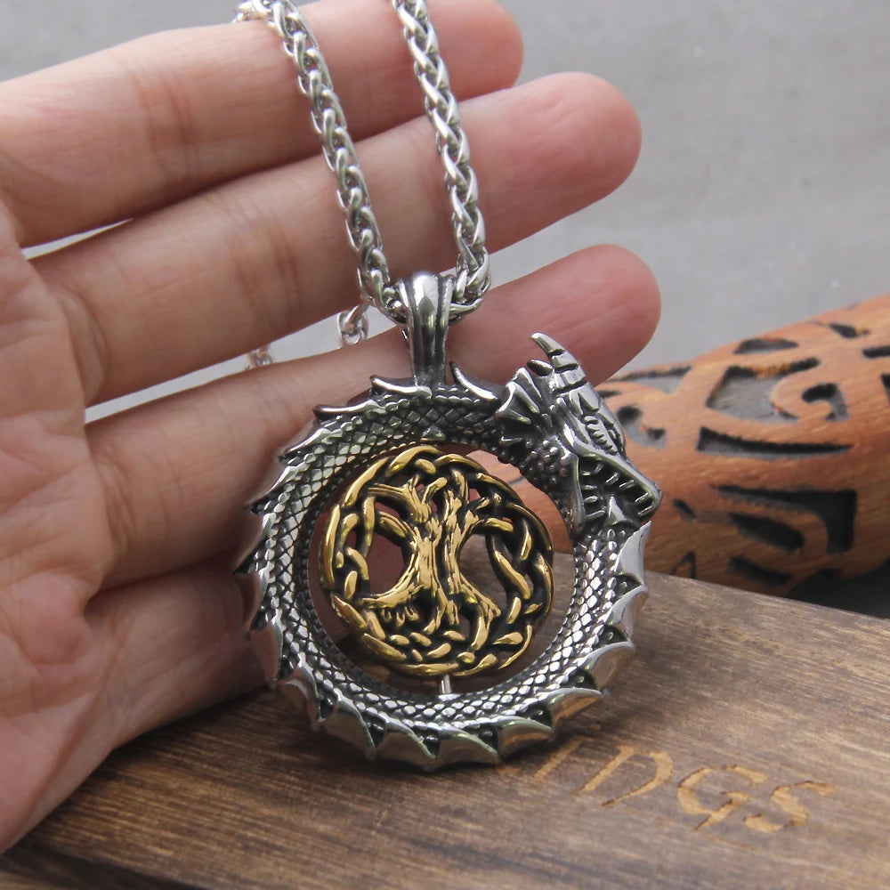 Never Fade Gold plated rotating life tree in Amulet ouroboros Pendant Necklace with vikings wood box