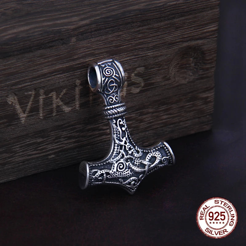 Name:925 Sterling Silver Thor Hammer Mjolnir choker Viking Amulet Scandinavian pendant necklace Norse Men Jewelry Metal:100% making by 925 Sterling Silver Mark:S925 Weight:about 26 Gram Color:Antique Silver Chain:When you buy our pendant,we will add a cow leather necklace 60cm and a Stainless Steel keel Chain 60cm and a Wood Viking box as gift
