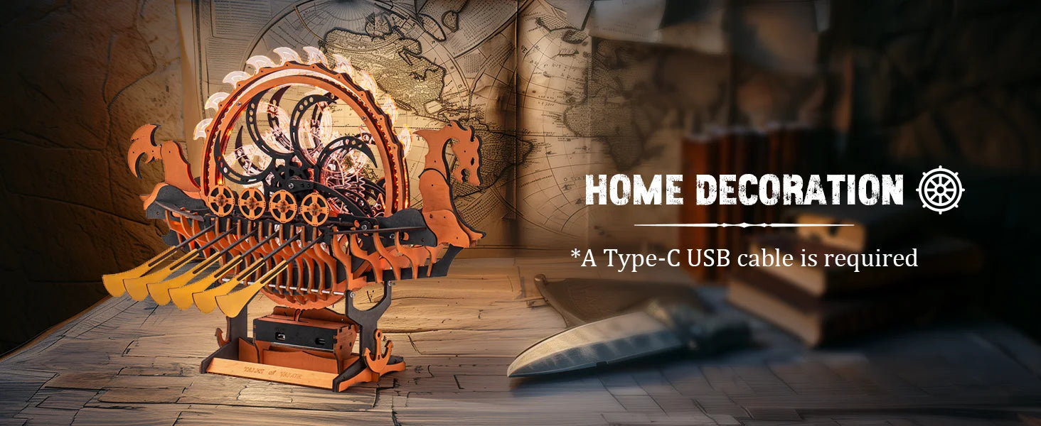 Embedded brown-red LED strips along the dragon's spine illuminate the acrylic components, simulating a fiery burning effect.