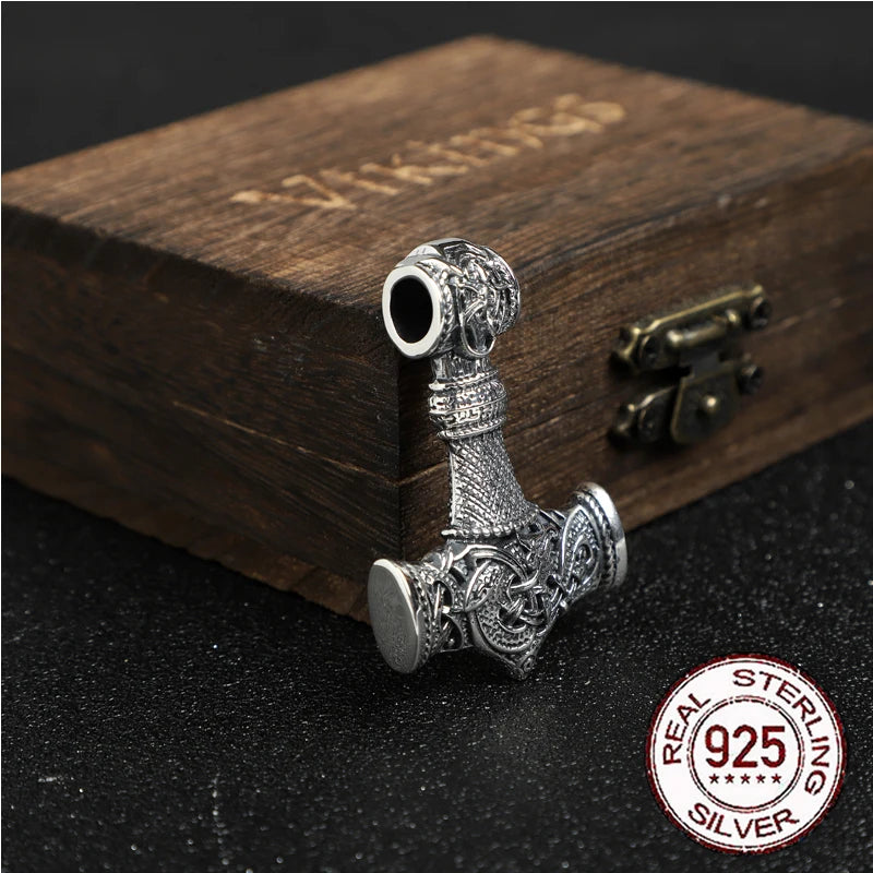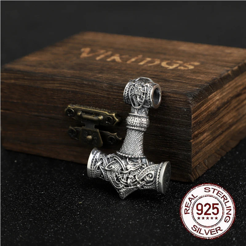 S925 Sterling Silver norse Viking thor's hammer mjolnir pendant necklace with leather chain wood box as gift Dropshipping