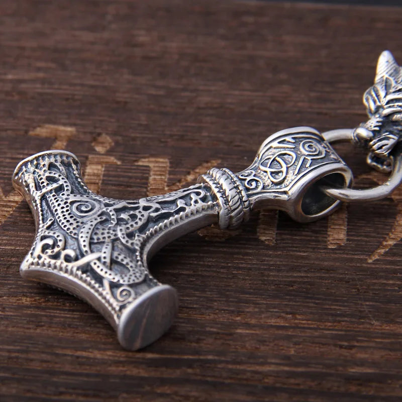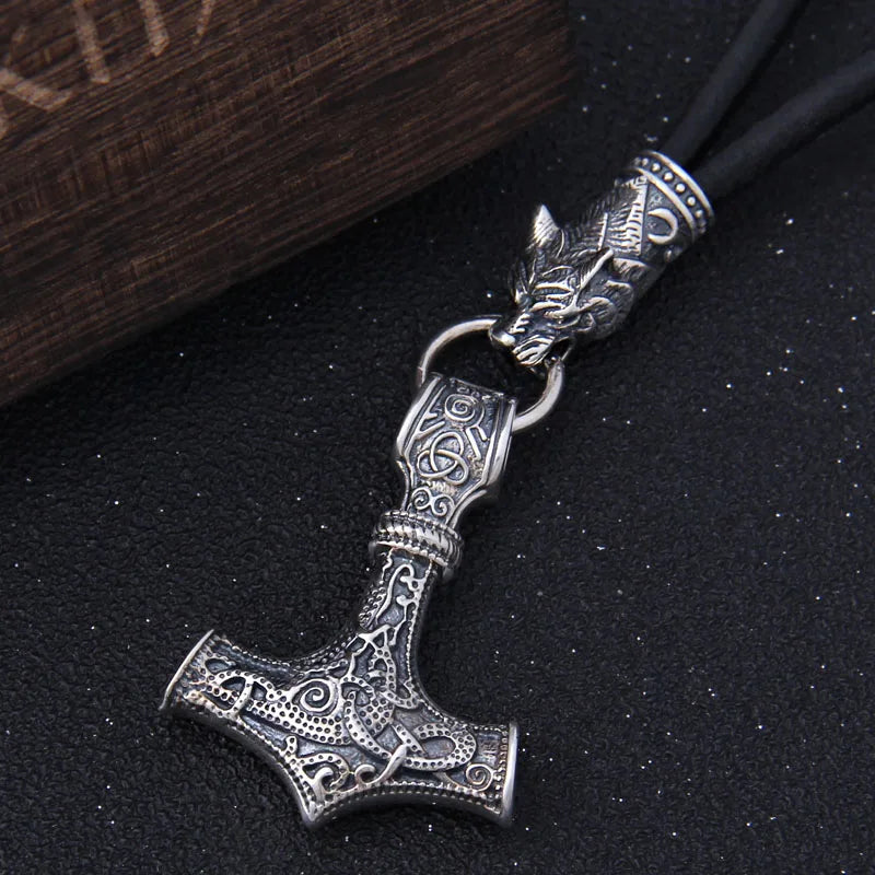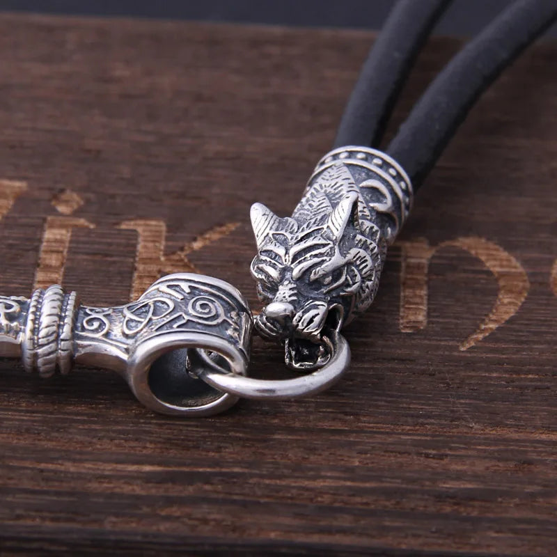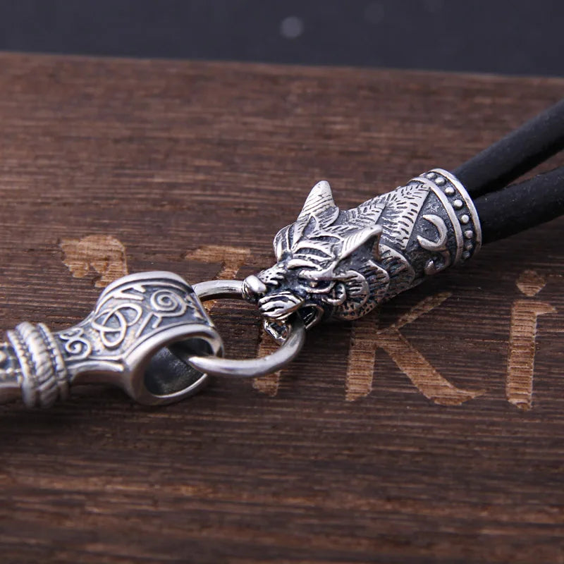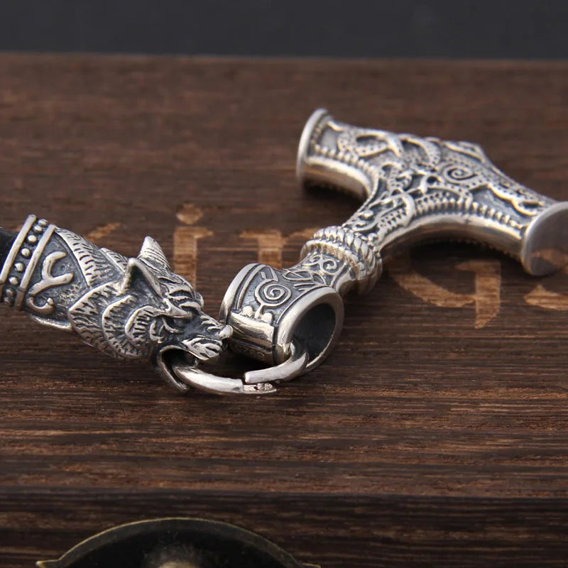 Name:S925 Sterling Silver Viking Wolf heads with thor's hammer mjolnir pendant leather men necklace as christmas gift Metal Of Pendant,Round Clasp,Wolf Head:Full making by S925 Sterling silver,not just plated,full metal is S925 Color:as photo show,Silver Color Material Of leather:real Cow Leather Size Of Thor's Hammer Pendant:33*45*8mm Size Of Wolf head:10*10*25mm Size Of Round Clasp on the Wolf head:13mm Packing:Put on the wood viking box as photo show