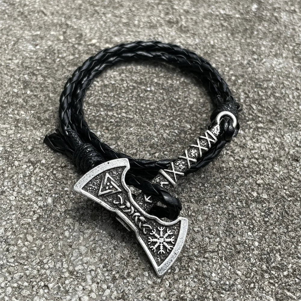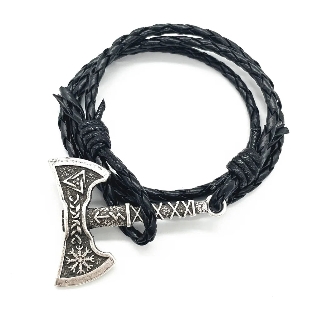 Viking Axe Charm Wolf Raven Amulet Slavic Kolovrat Norse Men's Leather Accessories Handmade Braided Wrap Pirate Bracelet