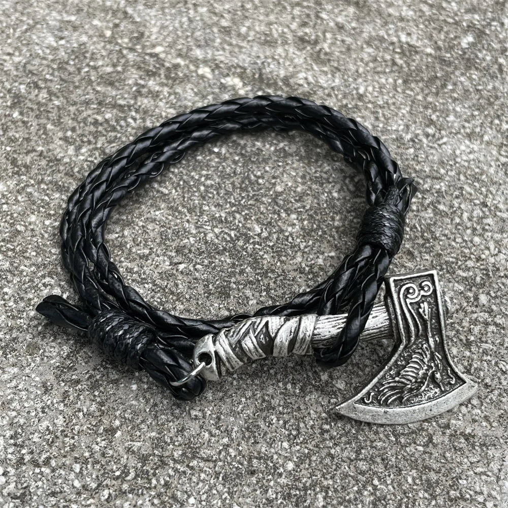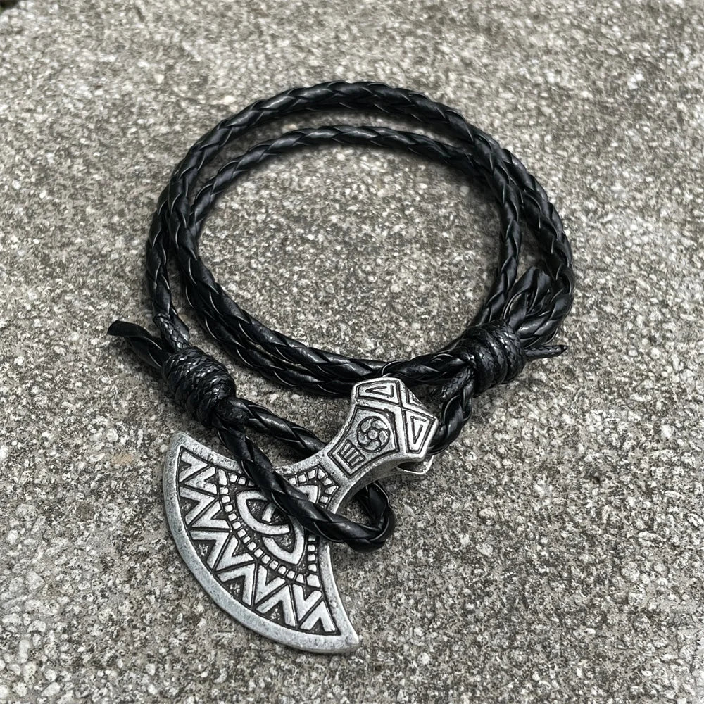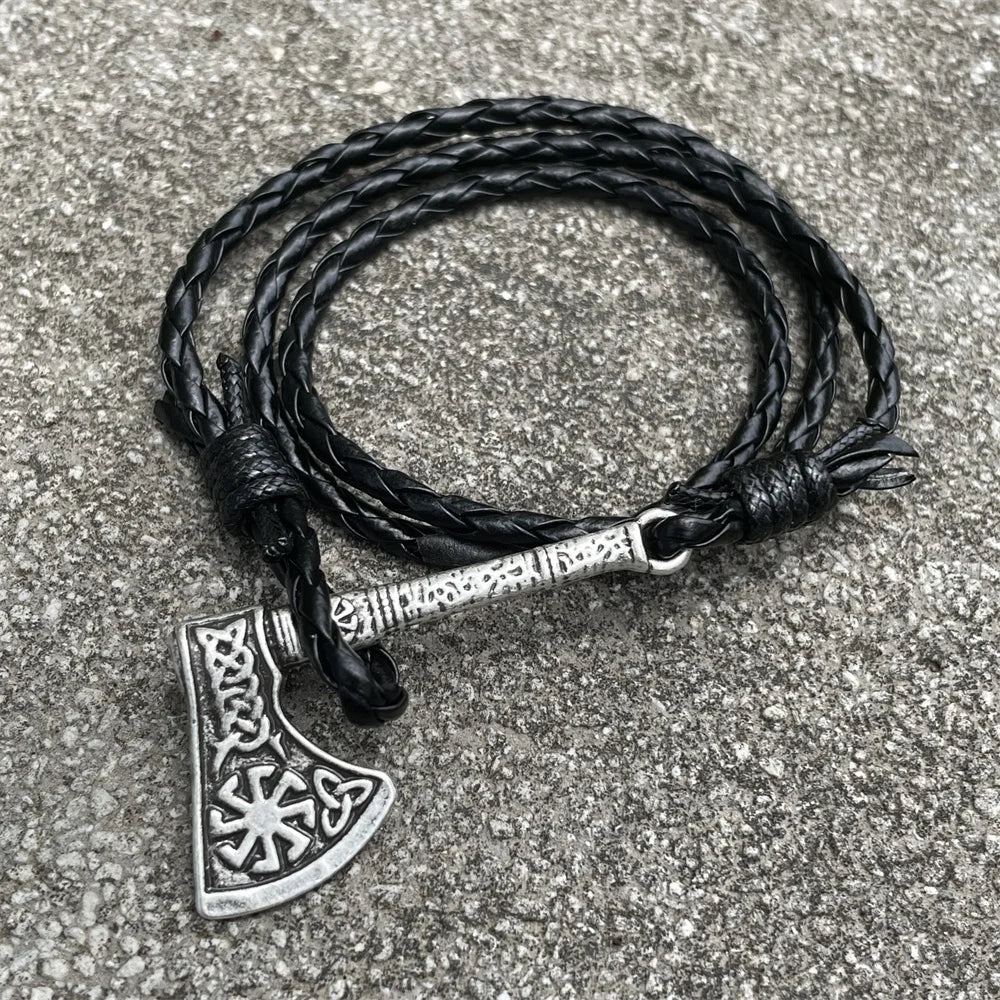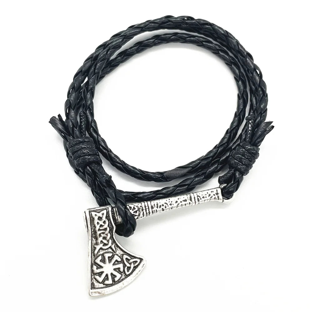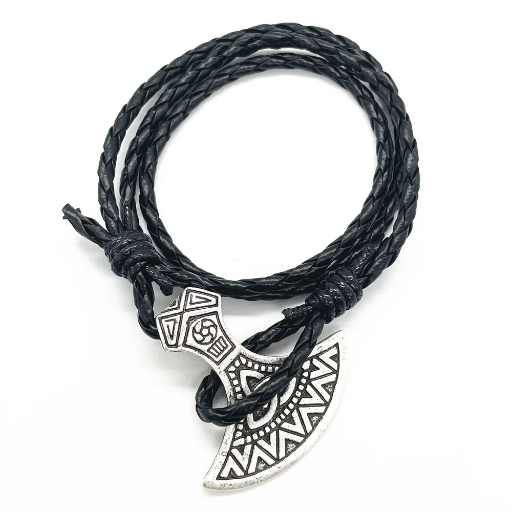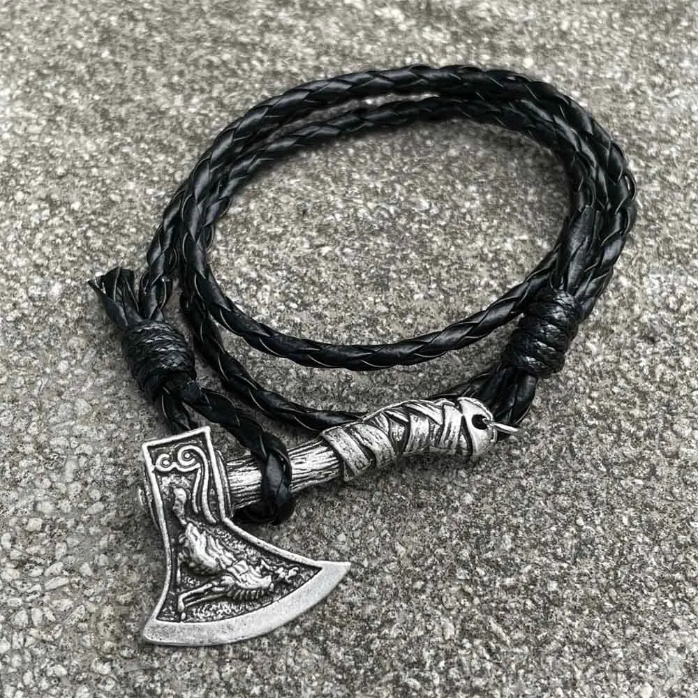 Viking Axe Charm Wolf Raven Amulet Slavic Kolovrat Norse Leather Braided Wrap Bracelet
