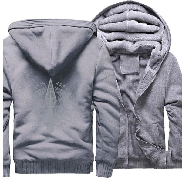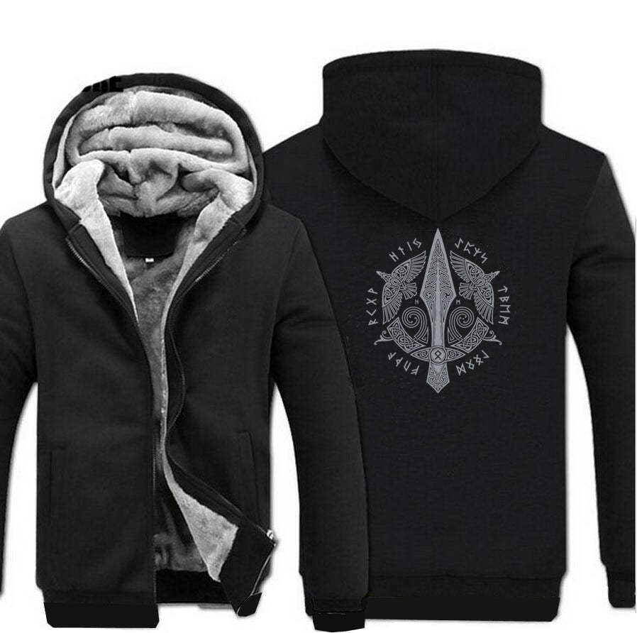 This Viking jacket will remain soft and will keep you warm. The design depicts a spiral circular pattern with the spear of Odin in the middle and the ravens of Odin designed in Vendel style and positioned right and left of the spear. Triquetra symbols also can be seen next to the ravens.