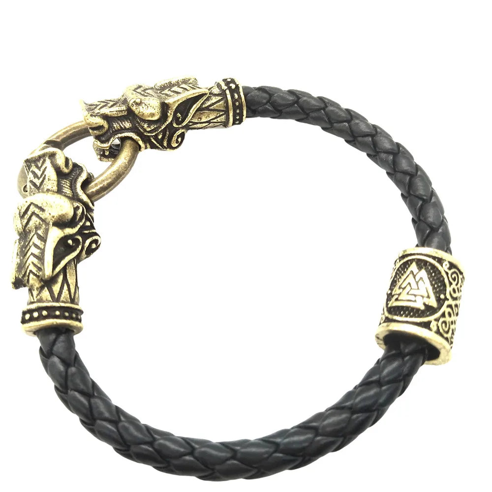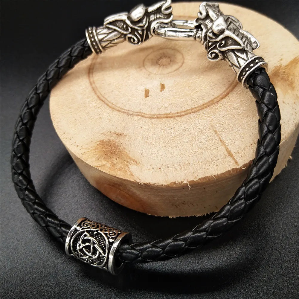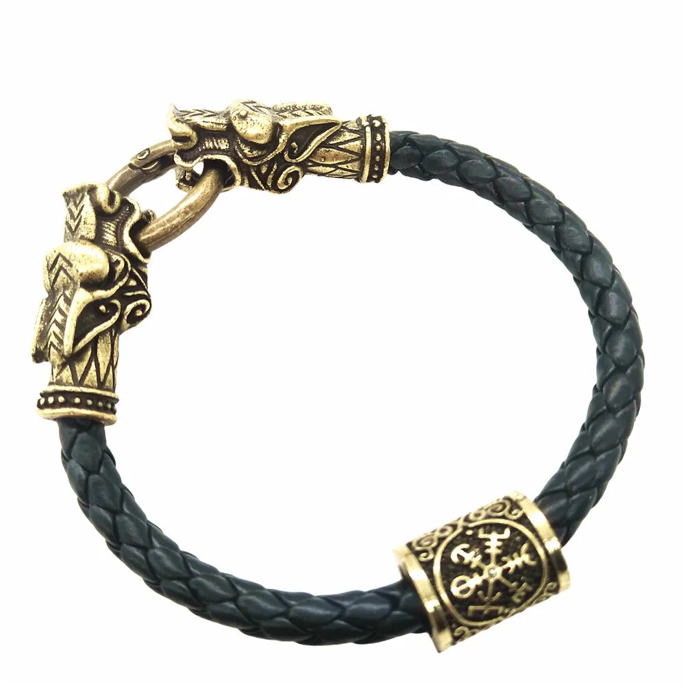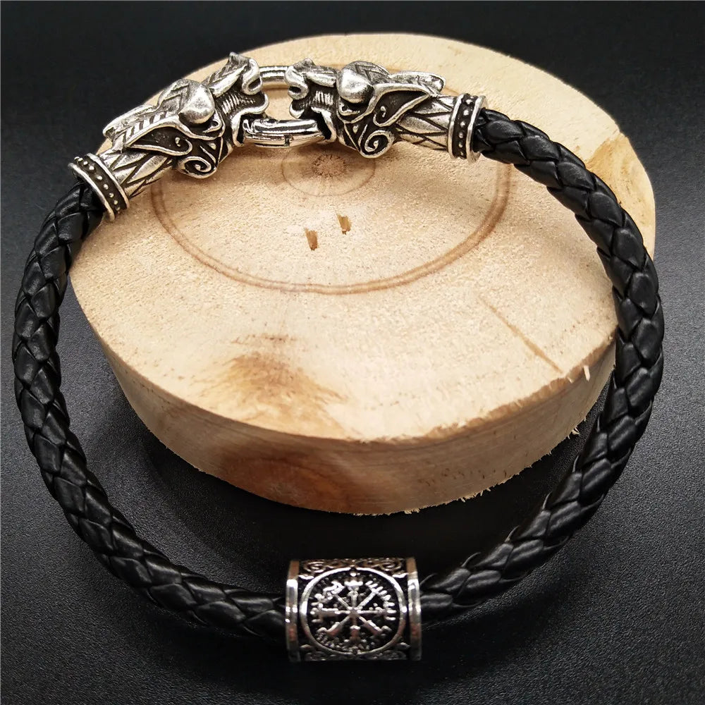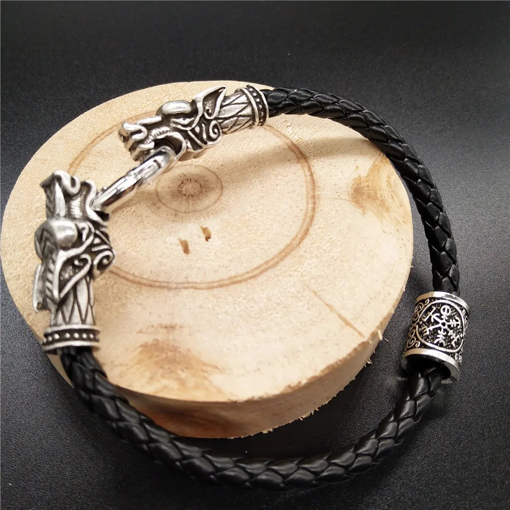 Vikingos Runes Beads Diy Charm Wolf Head Viking Jewelry Bracelet Leather Mens Bracelete Accessories